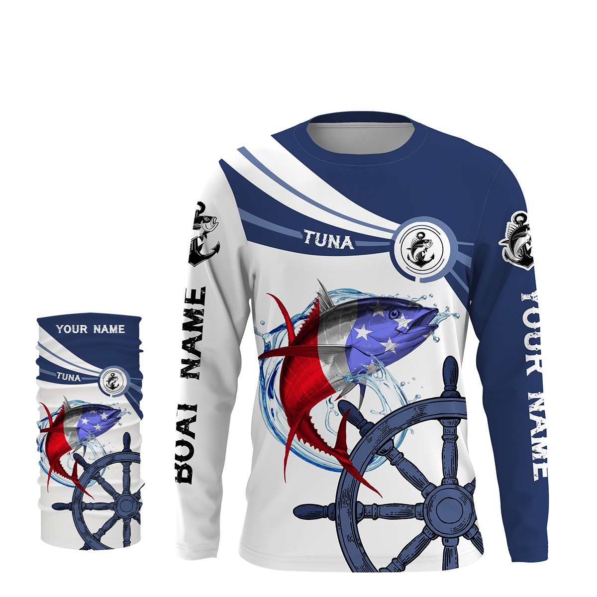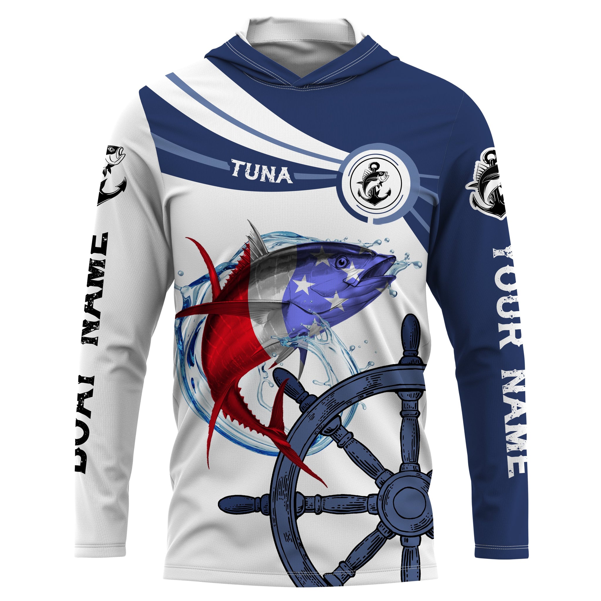 Tuna Fishing American Flag Custom name and boat name performance Long Sleeve Fishing Shirts, Patriotic Fishing gifts - NQS2412