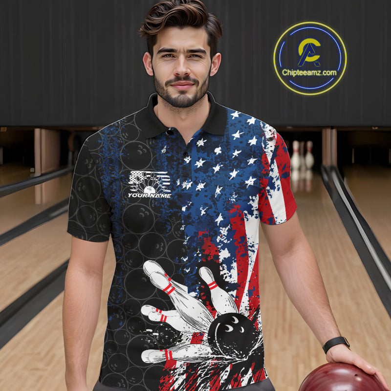 Custom Grunge Vintage American Flag Patriotic Bowling Team Jerseys, Bowling Men Polo Shirt IPHW9489