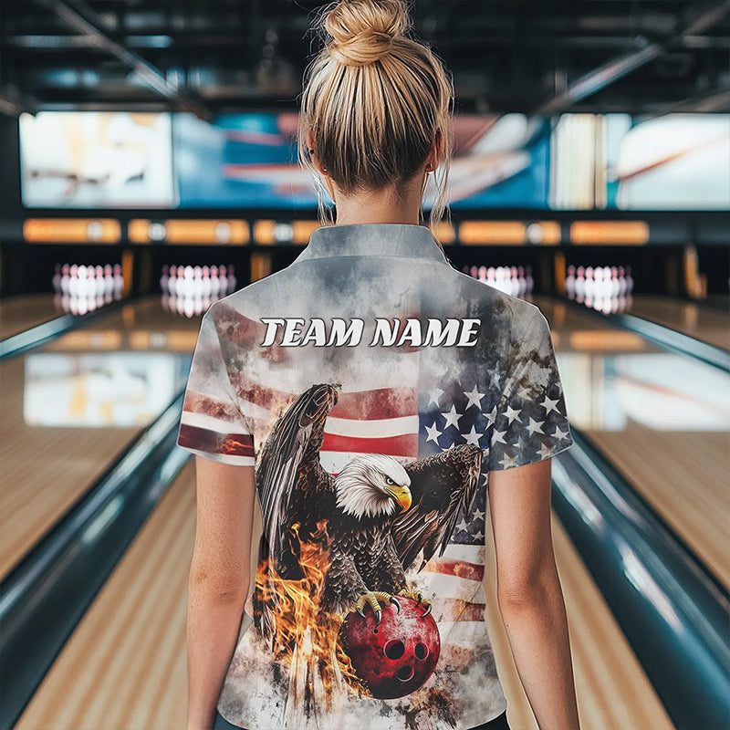Custom Vintage US Flag Eagle Womens Bowling Polo Shirt, Flame Eagle Patriotic Bowling Shirt IPHW8452