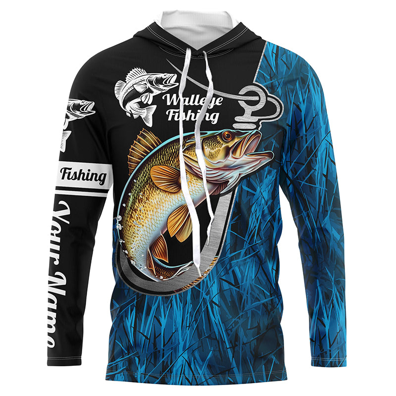 Fish Hook Walleye Fishing Custom Long Sleeve Tournament Fishing Shirts Fishing Jerseys | Blue Camo IPHW5736