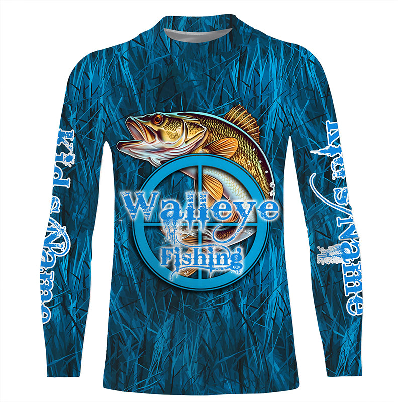 Personalized Walleye Long Sleeve Fishing Shirts, Walleye Tournament Fishing Shirts | Blue Camo IPHW5737