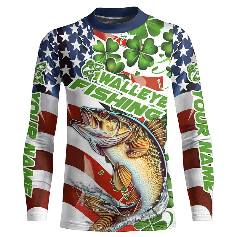 Personalized St Patrick'S Day Walleye Long Sleeve Fishing Shirts, Patriotic Walleye Fishing Jerseys IPHW5900
