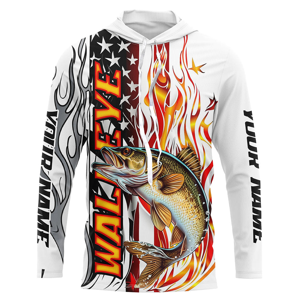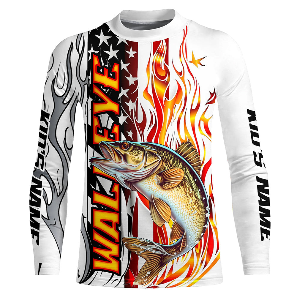 Flame American Flag Custom Walleye Long Sleeve Fishing Shirts, Patriotic Walleye Fishing Jerseys IPHW5941