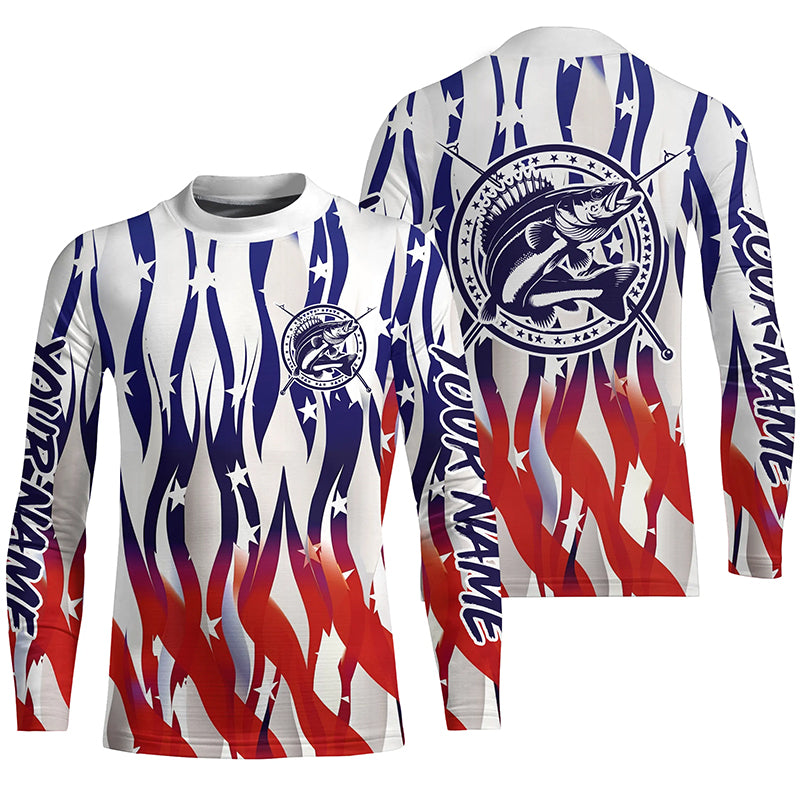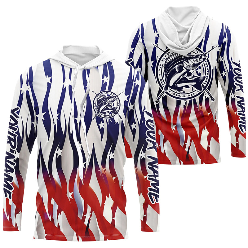 Flaming American Flag Custom Walleye Long Sleeve Fishing Shirts, Patriotic Walleye Fishing Jerseys IPHW5980