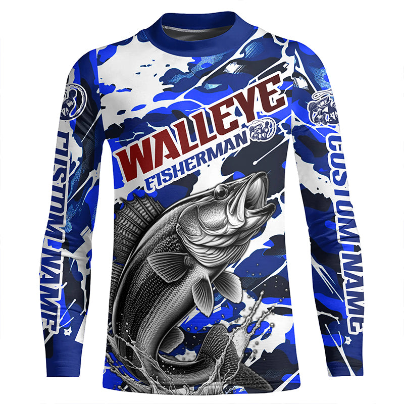 Personalized Walleye Fisherman Long Sleeve Fishing Shirt, Red White And Blue Camo Fishing Jerseys IPHW6458