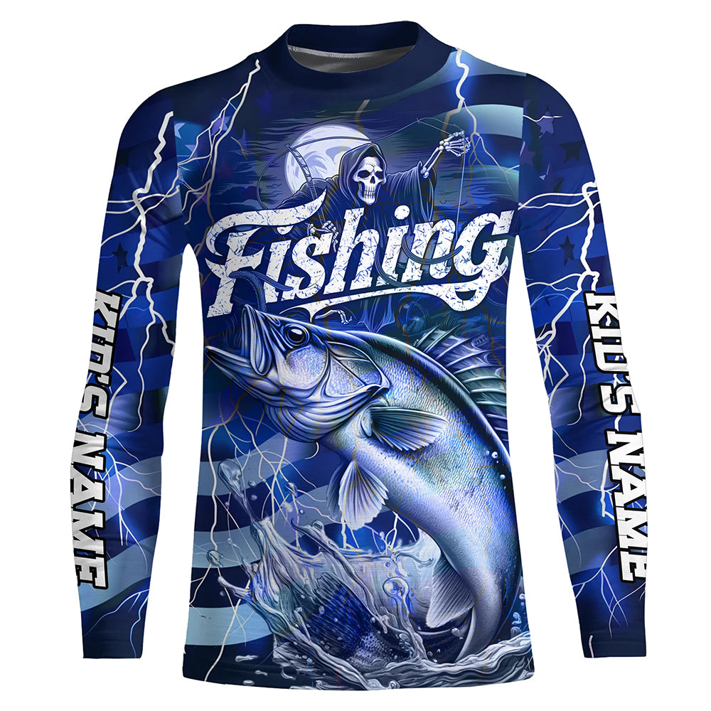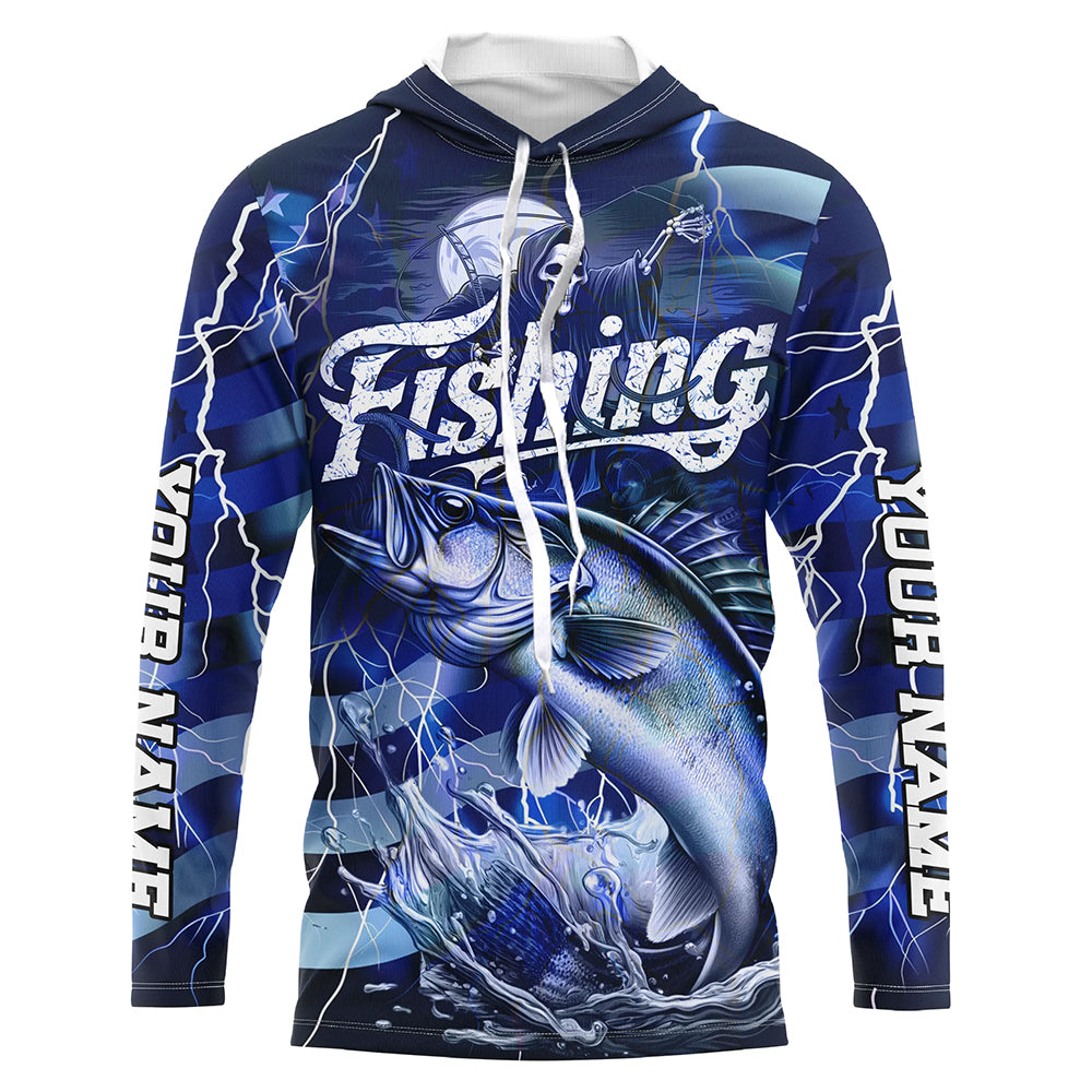 Blue Lightning American Flag Custom Walleye Fishing Long Sleeve Shirts, Fish Reaper Fishing Jerseys IPHW6685