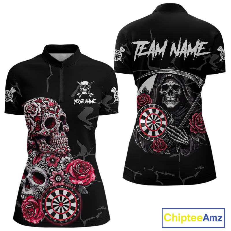 Personalized Red Funny Skull Roses Darts Shirt For Women Custom Darts Team Jersey, Darts Outfit TDM4356
