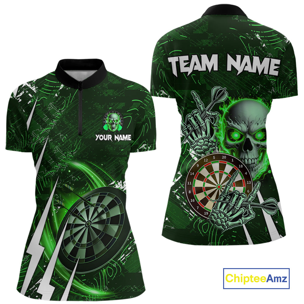 Green 3D Skull Darts Polo & 1/4 Zip For Women Custom Darts League Team Jersey, Best Darts Gifts TDM4829