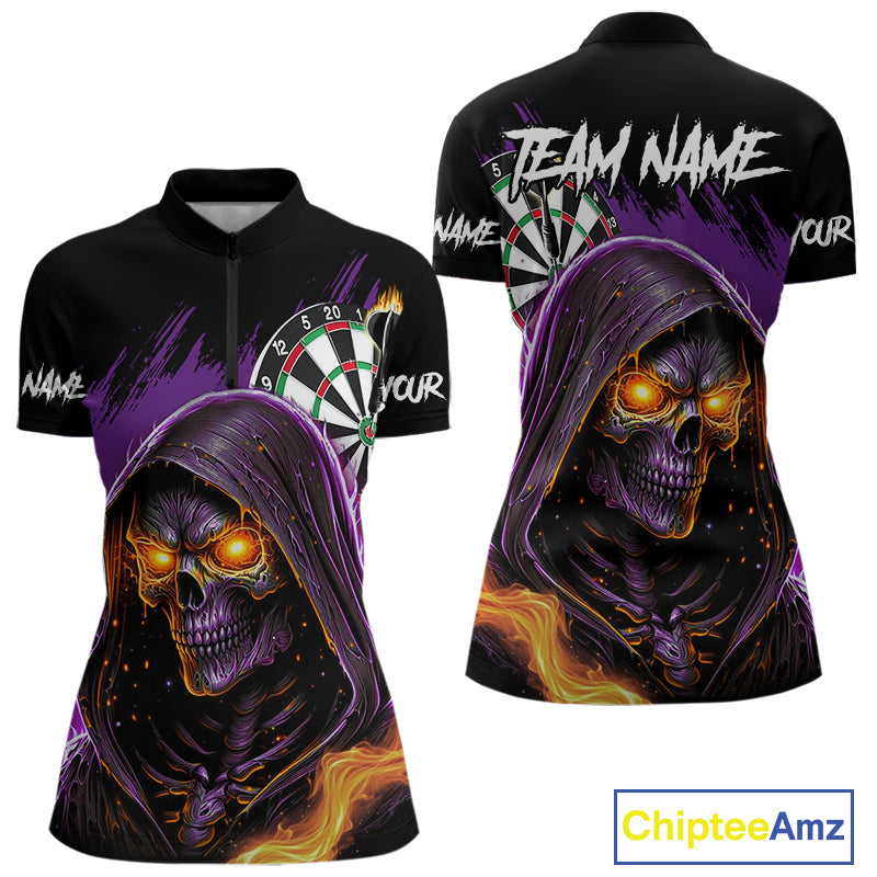 Personalized Purple Death Skeleton Fire Dart Shirt For Women Custom Skull Dart Jersey Polo & 1/4 Zip TDM4893