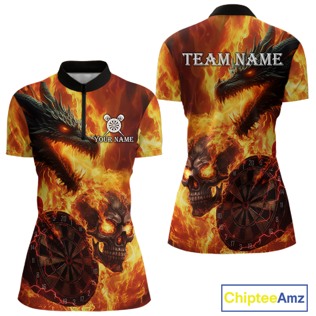 Personalized Orange Flaming Dragon And Skull Darts Shirt For Women Custom 3D Fire Darts Team Jersey TDM4958