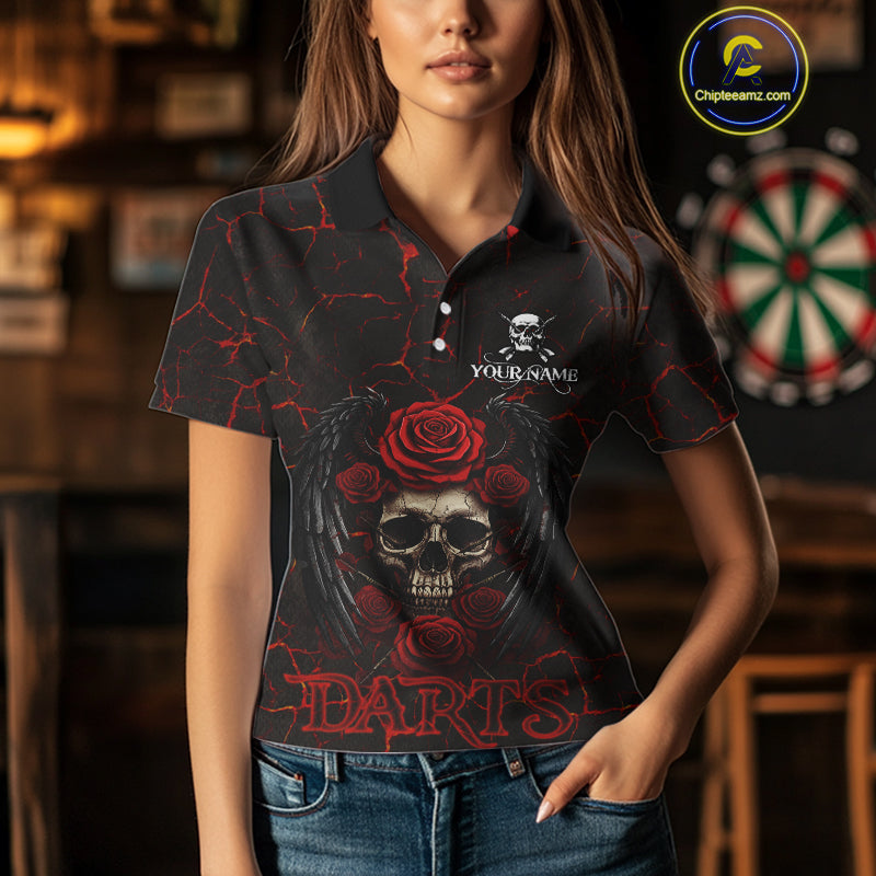 Personalized Skull And Roses Gothic Darts Shirt For Women Custom Red Dart Jersey Team Polo & 1/4 Zip TDM5041