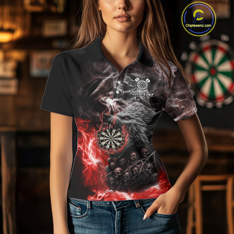 Personalized Wolf And Skull Smoke Red Womens Dart Shirts Custom Dart Jerseys Team Polo & 1/4 Zip TDM5185
